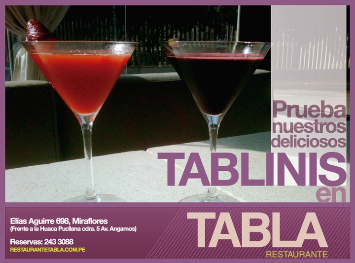 - En una privilegiada ubicación, frente a la Huaca Pucllana, se encuentra Tabla, un lugar para disfrutar del maridaje perfecto entre un sabroso plato y un buen vino. Su variada carta de pastas, cocina mediterránea y peruana está inspirada en aromas, sabores y culturas, brindando una propuesta deliciosa y diferente. Cuenta con una surtida cava que guarda más de 130 vinos y una amena barra para disfrutar de exquisitos y sofisticados cócteles con los amigos, en un ambiente casual, relajado, con buena música y atento servicio.